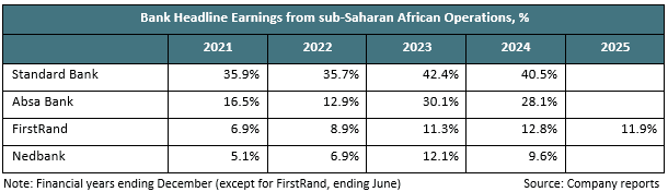The Who Owns Whom report indicates that the country’s low economic growth has affected the banking industry, leading big banks to increasingly turn to other countries on the African continent for growth. Expanding into sub-Saharan Africa has been a key focus of South African banks. The table below reflects the growing contributions: