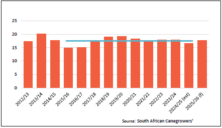 The graph here shows that sugar production declined by 7% to 1.94Mt in 2024/25, from 2.08Mt in 2023/24, but output in 2025/26 is expected to increase by 6%, supported by improved cane yields and sugar processing facility upgrades. Over the long term, there has not been a significant decline in production. Lower consumption has been offset by growing population numbers, keeping overall consumption at a reasonable level.