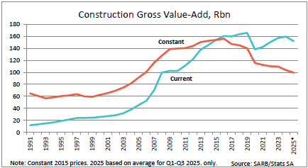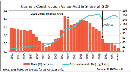 The industry’s persistent decline led to several large and listed construction companies collapsing or downsizing, with Basil Read, Group Five and Murray & Roberts being the most well-known casualties. Overall, it manifested as a drop in value-add and in its share of GDP, as illustrated here.